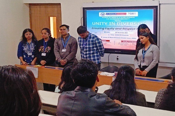 The School of Medical & Allied Sciences organised a vibrant Pan-University event titled “Unity in Diversity: Ensuring Equity and Respect for All,” celebrating cultural harmony, inclusiveness, and the rich diversity within the K.R. Mangalam University community. The programme began with a warm welcome and an inspiring inaugural address that highlighted the importance of unity, mutual respect, and cultural sensitivity in academic spaces. Students, faculty, and staff from various departments participated enthusiastically, engaging in performances, exhibits, and interactive activities that showcased regional traditions and promoted meaningful dialogue. The event also emphasised the significance of healthy eating, nutritional awareness, and the use of natural taste enhancers in maintaining overall well-being. By combining cultural celebration with wellness education, the initiative successfully reinforced the university’s commitment to fostering an inclusive, respectful, and health-conscious campus environment.