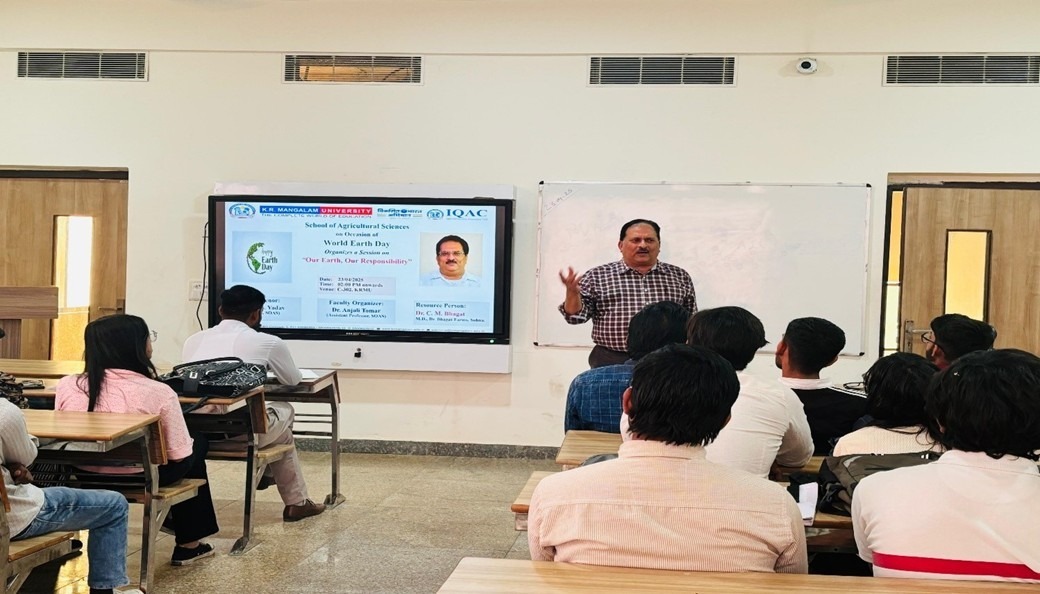 The School of Agricultural Sciences (SOAS) organised an impactful session titled “Our Earth, Our Responsibility” aligned with Sustainable Development Goal (SDG) 13: Climate Action. The keynote speaker, Dr. C. M. Bhagat, Managing Director of Bhagat Farms, Sohna, shared insights on sustainable agricultural practices, including organic farming, composting, rainwater harvesting, and renewable energy. He emphasised the importance of small daily actions—like reducing plastic use and planting trees—as meaningful steps toward a healthier planet. The session featured engaging discussions on climate-resilient crops, organic certification, and youth leadership in climate action.