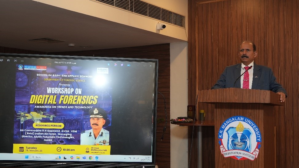 The School of Basic and Applied Sciences, K.R. Mangalam University organised a workshop on “Digital Forensics: Awareness on Trends and Technology” for Forensic Science students. The session was led by Air Commodore R.N. Gaekwad (Retd.), Managing Director of Idyllics Futuristic Technologies (IFT), who shared expert insights on drone forensics and its role in cybercrime investigations.