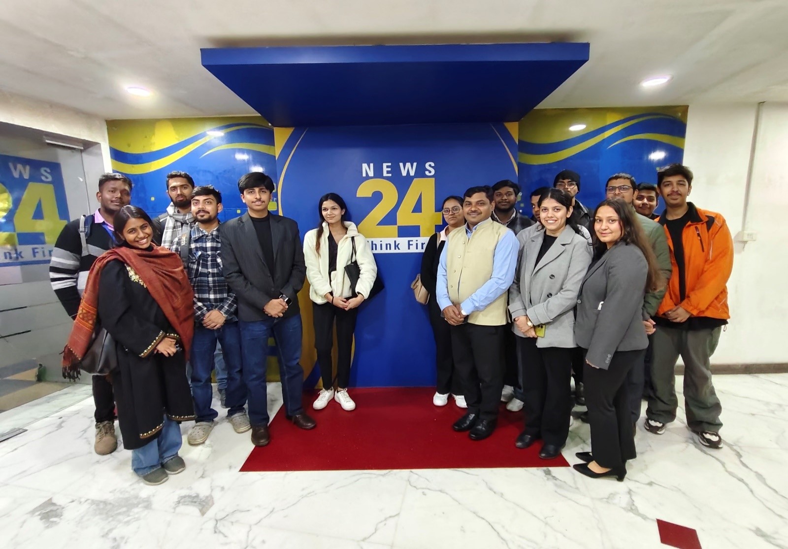 The School of Emerging Media & Creator Economy, K.R. Mangalam University, organised an industry visit to News 24 Channel, Noida, providing students with practical exposure to the workings of a television news organisation. The visit included attendance at the Live Manthan Conclave and guided tours of the Prime-Time Studio, Production Control Room (PCR), Master Control Room (MCR), Radio Studio, and regional news channels.
